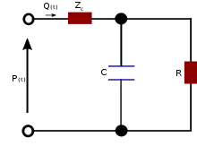 In the blood circulation, the passive elements in the circuit are assumed to represent elements in the cardiovascular system. The resistor, R, represents the total peripheral resistance and the capacitor, C, represents total arterial compliance.[7]