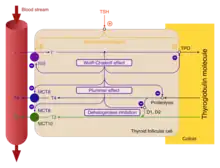 - ↑ Jing, Li; Zhang, Qiang (15 September 2022). "Intrathyroidal feedforward and feedback network regulating thyroid hormone synthesis and secretion". Frontiers in Endocrinology. 13: 992883. doi:10.3389/fendo.2022.992883. PMC 9519864.