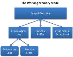 In 1974 Baddeley and Hitch[11] introduced the multicomponent model of working memory. The theory proposed a model containing three components: the central executive, the phonological loop, and the visuospatial sketchpad with the central executive functioning as a control center of sorts, directing info between the phonological and visuospatial components.[12] The central executive is responsible for, among other things, directing attention to relevant information, suppressing irrelevant information and inappropriate actions, and coordinating cognitive processes when more than one task is simultaneously performed. A "central executive" is responsible for supervising the integration of information and for coordinating subordinate systems responsible for the short-term maintenance of information. One subordinate system, the phonological loop (PL), stores phonological information (that is, the sound of language) and prevents its decay by continuously refreshing it in a rehearsal loop. It can, for example, maintain a seven-digit telephone number for as long as one repeats the number to oneself repeatedly.[13] The other subordinate system, the visuospatial sketchpad, stores visual and spatial information. It can be used, for example, for constructing and manipulating visual images and for representing mental maps. The sketchpad can be further broken down into a visual subsystem (dealing with such phenomena as shape, colour, and texture), and a spatial subsystem (dealing with location).