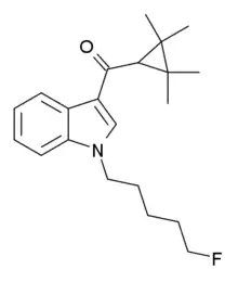 XLR-11 (5"-fluoro-UR-144 or 5F-UR-144) is a drug that acts as a potent agonist for the cannabinoid receptors CB1 and CB2 with EC50 values of 98 nM and 83 nM, respectively.[2] It is a 3-(tetramethylcyclopropylmethanoyl)indole derivative related to compounds such as UR-144, A-796,260 and A-834,735, but it is not specifically listed in the patent or scientific literature alongside these other similar compounds,[3][4] and appears to have not previously been made by Abbott Laboratories, despite falling within the claims of patent WO 2006/069196. XLR-11 was found to produce rapid, short-lived hypothermic effects in rats at doses of 3 mg/kg and 10 mg/kg, suggesting that it is of comparable potency to APICA and STS-135.[2]
