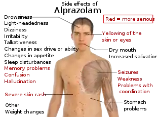 Common side effects include sleepiness, depression, headaches, feeling tired, dry mouth, and memory problems.[2] Some of the sedation and tiredness may improve within a few days.[10] Due to concerns about misuse, some do not recommend alprazolam as an initial treatment for panic disorder.[11] Withdrawal or rebound symptoms may occur if use is suddenly decreased;[2] gradually decreasing the dose over weeks or months may be required.[8] Other rare risks include suicide, possibly due to loss of inhibition.[12] Alprazolam, like other benzodiazepines, acts through the GABAA receptor.[2]