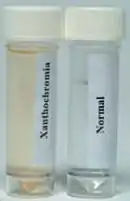 Xanthochromia, from the Greek xanthos (ξανθός) "yellow" and chroma (χρώμα) "colour", is the yellowish appearance of cerebrospinal fluid that occurs several hours after bleeding into the subarachnoid space caused by certain medical conditions, most commonly subarachnoid hemorrhage.[1] Its presence can be determined by either spectrophotometry (measuring the absorption of particular wavelengths of light) or simple visual examination. It is unclear which method is superior.[2]
