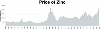 Identified world zinc resources total about 1.9–2.8 billion tonnes.[33][34] Large deposits are in Australia, Canada and the United States, with the largest reserves in Iran.[31][35][36] The most recent estimate of reserve base for zinc (meets specified minimum physical criteria related to current mining and production practices) was made in 2009 and calculated to be roughly 480 Mt.[37] Zinc reserves, on the other hand, are geologically identified ore bodies whose suitability for recovery is economically based (location, grade, quality, and quantity) at the time of determination. Since exploration and mine development is an ongoing process, the amount of zinc reserves is not a fixed number and sustainability of zinc ore supplies cannot be judged by simply extrapolating the combined mine life of today's zinc mines. This concept is well supported by data from the United States Geological Survey (USGS), which illustrates that although refined zinc production increased 80% between 1990 and 2010, the reserve lifetime for zinc has remained unchanged. About 346 million tonnes have been extracted throughout history to 2002, and scholars have estimated that about 109–305 million tonnes are in use.[38][39][40]