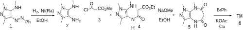 The catalytic hydrogenation of N,2,5-trimethyl-4-phenyldiazenylpyrazol-3-amine[lower-alpha 1] (1) over Raney nickel gives 4-amino-1,3-dimethyl-5-methylaminopyrazole[lower-alpha 2] (2). Treatment with methyl malonyl chloride[lower-alpha 3] (3) gives 4-α-ethoxycarbonylacetylamino-1,3-dimethyl-5-methylaminopyrazole[lower-alpha 4] (4). Base-catalyzed lactamization gives (5). The Goldberg reaction completes the synthesis of zomebazam (6).[3][4]
