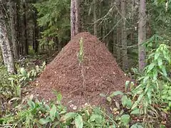 Wood ants (Formica paralugubris) often incorporate large quantities of solidified conifer resin into their nests. Laboratory studies have shown this resin inhibits the growth of bacteria and fungi in a context mimicking natural conditions.[54] The ants show a strong preference for resin over twigs and stones, which are building materials commonly available in their environment. There is seasonal variation in the foraging of ants: the preference for resin over twigs is more pronounced in spring than in summer, whereas in autumn the ants collect twigs and resin at equal rates. The relative collection rate of resin versus stones does not depend on infection with the entomopathogenic fungus Metarhizium anisopliae in laboratory conditions, indicating the resin collection is prophylactic rather than therapeutic.[55]