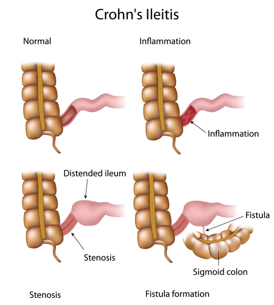 Intestinal blockage is a common complication of Crohn's disease. Blockages are caused by swelling or a buildup of scar tissue in the intestinal walls. Some affected individuals also develop fistulae, which are abnormal connections between the intestine and other tissues. Fistulae occur when ulcers break through the intestinal wall and passages form between loops of the intestine or between the intestine and nearby structures (such as the bladder, vagina, or skin).