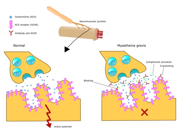 Myasthenia gravis is an autoimmune disorder, which occurs when the immune system malfunctions and attacks the body's own tissues and organs. In myasthenia gravis, the immune system disrupts the transmission of nerve impulses to muscles by producing a protein called an antibody that attaches (binds) to proteins important for nerve signal transmission. Antibodies normally bind to specific foreign particles and germs, marking them for destruction, but the antibody in myasthenia gravis attacks a normal human protein. In most affected individuals, the antibody targets a protein called acetylcholine receptor (AChR); in others, the antibodies attack a related protein called muscle-specific kinase (MuSK). In both cases, the abnormal antibodies lead to a reduction of available AChR.