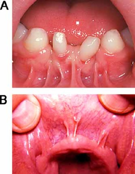 Abnormalities of the oral cavity that occur in many types of oral-facial-digital syndrome include a split (cleft) in the tongue, a tongue with an unusual lobed shape, and the growth of noncancerous tumors or nodules on the tongue. Affected individuals may also have extra, missing, or defective teeth. Another common feature is an opening in the roof of the mouth (a cleft palate). Some people with oral-facial-digital syndrome have bands of extra tissue (called hyperplastic frenula) that abnormally attach the lip to the gums.