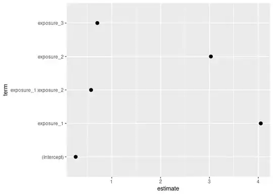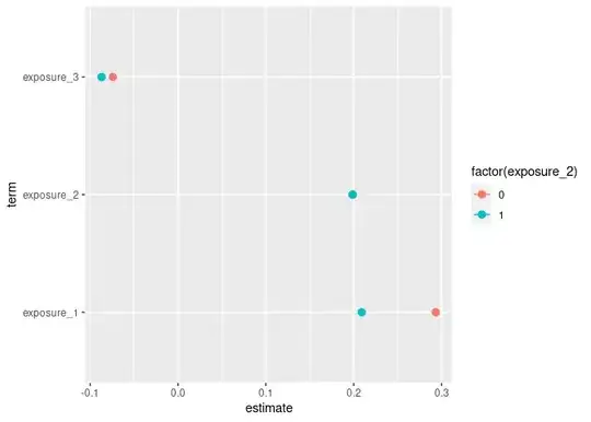 For exposure_1, I am trying to calculate and display the marginal effects of binary exposure_2 against the full model. I am unsure how to obtain these values. Once I have them, I need to translate them into tidy() format to display in my forest coefficient plot. I am also having difficulty creating this code.
