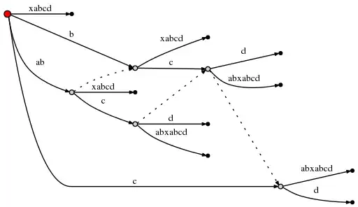 that. Why does that matter? --> If later we use the completed suffix tree to search for suffixes, we must accept matches only if they end at a leaf. Otherwise we would get a lot of spurious matches, because there are many strings implicitly contained in the tree that are not actual suffixes of the main string. Forcing- remainderto be 0 at the end is essentially a way to ensure that all suffixes end at a leaf node. However, if we want to use the tree to search for general substrings, not only suffixes of the main string, this final step is indeed not required, as suggested by the OP's comment below.