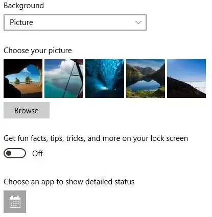 But here is a registry trick: now set RotatingLockScreenOverlayEnabled and SubscribedContent-338387Enabled back to 0. The result is almost what the asker tries to do – the lock screen shows one of the spotlight images, while not displaying any "fun facts" on the lock screen. The caveat is that the currently displayed spotlight image will never change – unless you force it to. 4