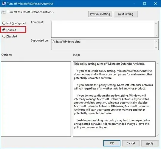 I have Windows 10 ver 2004. Since Windows Defender changed to Microsoft Defender Antivirus I'm unable to turn it off. In Local Group Policy (gpedit.msc) under Computer Configuration/Administrative Templates/Windows Components/Microsoft Defender Antivirus there is a key "Turn off Microsoft Defender Antivirus". Every time I check "enable" and log out or reboot the key is back to "Not configured". How to keep it disabled permanently, and therefore turn off Microsoft Defender Antivirus essentially?