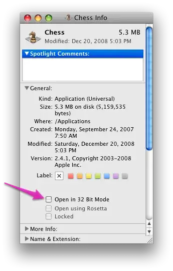 Finally, if you want to know whether a particular program is actually running in 64-bit mode, Activity Monitor will tell you under both 10.5 and 10.6 (I dunno about 10.4).