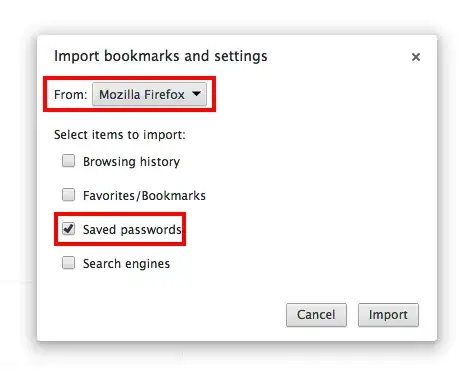 Select Firefox from the drop-down menu and ensure that the "Saved Passwords" box is checked. Finally, click import.
