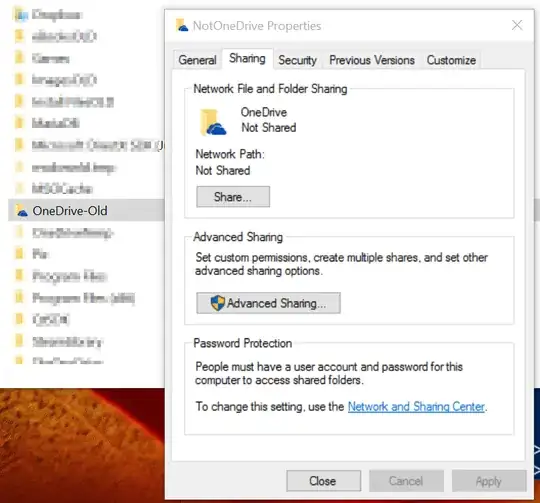 I've got this old OneDrive folder which I've renamed in Explorer to "OneDrive-Old". However, it keeps colliding when I try to create a new folder called "OneDrive". Turns out, it's name is actually still "OneDrive" as can be seen on this "Sharing" tab.