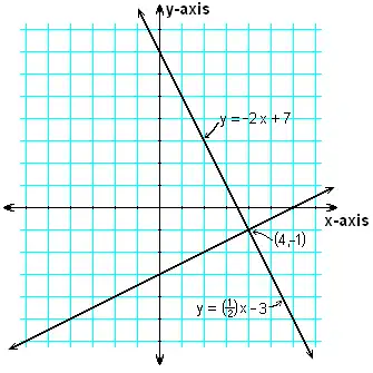 Both of these equations are given in the slope-intercept, so it is easy to compare slopes and y-intercepts. For these two linear functions, both slopes are different and both y-intercepts are different. This means the lines are neither dependent nor inconsistent, so on a two-dimensional graph they must intersect at some point. In fact, the graph shows the lines intersecting at (1,-2), which is the ordered pair solution to this system of independent simultaneous equations. Visual inspection of a graph cannot be relied on to give perfectly accurate coordinates every time, so either the point is tested with both equations or one of the following two methods is used to determine accurate coordinates for the intersection point.