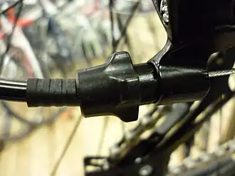 - Fix the cable terminal: Insert the cable terminals, the barrel, pear-end, or button into the brake lever or shifter in accordance with the instructions for the equipment. For brakes this usually means lining up the slots in the barrel adjusters so that the terminals can be anchored in the underside of the levers. Some shifters use a similar method but others are pre-wired, (e.g.: SRAM GripShift 7-speed Comp); in these latter cases be careful not remove the cable from the shifter.