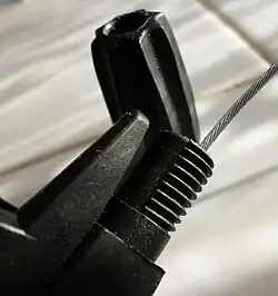 - In the case of brakes: After attaching the piece with the end nipple, fix its nipple into the slot on the brake's cable bridge, and loose-wire the cable past the cable clamp. Take up the slack, check the cable remains in place and that the ferrules are still seated.