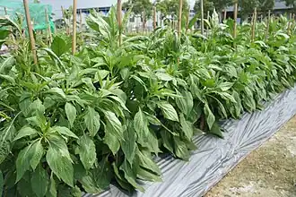 The tender leaves are bright green, with some varieties striated with a reddish purple color.[1][2] The flavor is mild and somewhat like that of spinach.[3]
