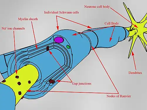 (a) dendrite, (b) cell body, (c) nucleus, (d) axon cone, (e) myelin, (f) nucleus of a Schwann cell, (g) node of Ranvier, (h) axon terminal