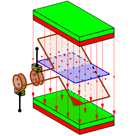If we place a conducting loop in a constant magnetic field and rotate it around a diameter perpendicular to the magnetic field, the Lorentz force sets the electrons in motion in the direction of the conducting wire, as soon as the rotation of the loop imposes on them a movement which is not parallel to the magnetic field. This movement of electrons in the direction of the wire manifests the presence of an electrical voltage. We can therefore make an electric generator by rotating a conductive loop in a constant magnetic field: