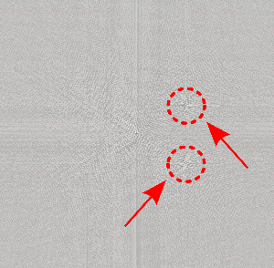 Looking at the spectrum you should be able to see bright small spots. Those represent the spectrum of the noise you want to remove. Since it was very regular, its power will be very concentrated in the frequency domain. In the picture on the right, you can see the spectrum of the red layer, with two blinking arrows pointing where those spots are. The red layer was chosen just because the spots were more evident (that also means that most of the noise was contained in the red layer). All you have to do now is to delete them. If you were thinking about using the Erase tool, that's not such a good idea, because deleting the information completely will cause a sharp change in the spectrum, thus introducing even more coherent noise. You have to delete them smoothly. One way is to use the Blur tool - since it has an "averaging" effect; if you use it on the bright spots, you will actually decrease its magnitude without deleting them completely. Another possibility is to use the paintbrush tool with a mid-grey colour (808080 in hexadecimal notation). You can not know exactly where the noise ends and where the information you want to keep starts. You might have to experiment a bit to get a good result.