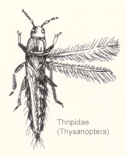 Thrips (Order Thysanoptera) are tiny, slender insects with fringed wings (thus the scientific name, from the Greek thysanos (fringe) + pteron (wing)). Other common names for thrips include thunderflies, thunderbugs and corn lice. Thrips species feed on a large variety of sources both plant and animal by puncturing them and sucking up the contents. A large number of thrips species are considered pests, because they feed on plants with commercial value. Some species of thrips feed on other insects or mites and are considered beneficial, while some feed on fungal spores or pollen. So far around 5,000 species have been described.