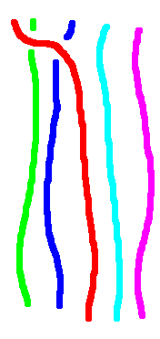 The five-string English sinnet is a very simple sinnet to create, and closely related to the three-string version. You start by putting the five strings next to each other. Then you pick the leftmost string and cross it over the middle string. Then, you pick the rightmost string, and cross it over the middle string. Repeat this process alternating the leftmost and rightmost string, until the desired length is reached.