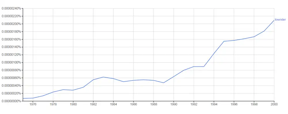 The Google Ngram below is a rough depiction of the popularity of the term “lowrider” from 1975 to 2000. The graph shows some correlation to the significant appearances in print, television, movies, and music mentioned. The rise of Lowrider Magazine and popularity in television and movies from the 1970’s to the early 1980’s is matched by a rise on the graph. The period of slight decline or stagnation in the graph occurs around 1985-1988, a period when lowrider Magazine went out of circulation. The graph begins to rise again when the magazine was revived and rises faster during the early 1990’s when lowriders were popular in rap culture.