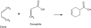 Another interesting conjugated diene reaction is the Diels-Alder reaction, in which a conjugated diene reacts with an alkene (called a "dienophile" in this case) in order to yield a cyclic product. In Diels-Alder type reactions, the substituent on the dienophile will go into either an exo or endo position in the final product. ("Endo" in this case meaning trans to the substituents on the ends of the diene, and "exo" meaning the same thing, only cis.)