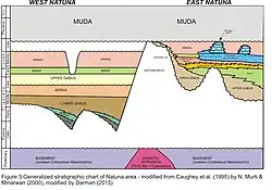 Above Arang Formation, Muda Formation was deposited unconformably in shallow marine environment. The Base Muda unconformity is widely recognised at West Natuna basin. The Muda Formation consists of mudstone, shales and sands. This formation is formed from Late Miocene until the present time.