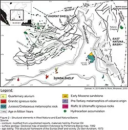 Underlying the sequences of the West Natuna Basin is the Cretaceous basement, which according to Pollock et al. (1984) is comprised of amphibolites. According to a more detailed recent study the basement actually comprises intrusive acidic-type igneous rocks such as quartz-diorite, granite and phyllite, chlorite-schist, gneiss and amphibolite.