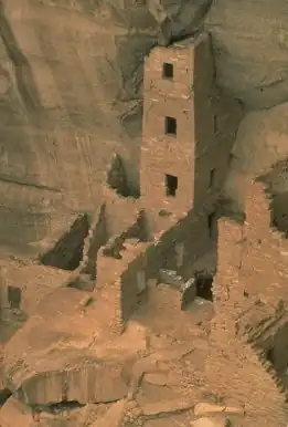 The Ancient Pueblo people are famous for their cliff dwellings. Mesa Verde in south western Colorado has several built into its sides. Cliff Palace is a particularly well known dwelling there. It has 220 rooms, in several stories and 23 kivas. The design of Cliff Palace seems random. Different people added new rooms slowly. Over many years, it took shape. People who lived there grew their food on the top of the mesa above them. They had to climb the face of a steep cliff to get home. They used small hand and foot holds carved in the rock.
