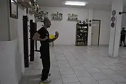 - Without moving anything except the left forearm, perform a left hand Gahn Sau.