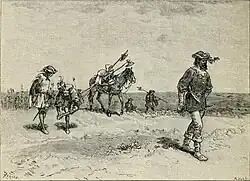 Cabeza de Vaca's father and grandfather died around 1506 and his mother died in 1509, leaving behind a modest estate for her seven children. His younger siblings went to live with their aunt but Álvar had already entered the service of Juan Alfonso Pérez de Guzmán, 3rd Duke of Medina Sidonia in 1503.[11] The house of Medina Sidonia was one of the most powerful in Andalusia and was a dominant force in Seville, the commercial center of Spain's growing overseas empire. Cabeza de Vaca served as a page and then chamberlain for the duke. In 1511 he traveled to Italy to fight against the French in the Italian Wars. In February 1512 he took part in the Battle of Ravenna where the Spanish were badly defeated and Cabeza de Vaca was wounded. He later served as the royal standard-bearer in Gaeta, near Naples.[12]
