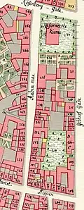 Several of the other buildings in the street also date from the 18th century and are examples of the so-called "fire houses" that were built immediately after the Fire of 1728. No. 25 was originally built for court sculptor Friderich Ehbisch in 1733. Its facade was originally decorated with reliefs on all floors as well as on the dormer but they were removed when the building was converted into a warehouse in 1895–96.[4] The neighbouring building at No. 27 was built for Trabant Elias Dordé. The painter Wilhelm Bendz lived in the building in the late 1820s and early 1830s.[5] No. 23 (Åbenrå 23 / Hauser Plads 24) is also from the 1730s and listed.