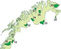 Ånderdalen National Park (Norwegian: Ånderdalen nasjonalpark) is located on the large island of Senja in Troms county, Norway. The 134-square-kilometre (52 sq mi) park lies within Senja Municipality. The park was established by royal decree on 6 February 1970 and it was enlarged in 2004. The national park preserves this Northern Norwegian coastal landscape. The bedrock consists of hard granite rocks and the landscape image gives exciting impressions of the glacial forces that have worked on Senja. The coastal pine forest in Ånderdalen has in some areas primeval forest with over 600 years old trees and countless marble pines and lower. Along the river there are many lush hawked birch forests and floodplain forests.[1]