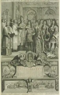 Élisabeth Charlotte was finally married on 13 October 1698 at the Palace of Fontainebleau to Leopold, Duke of Lorraine, son of Charles V, Duke of Lorraine, and Archduchess Eleonora of Austria.The marriage was the result of the Peace of Ryswick, one of its conditions being that the Duchy of Lorraine, which had been the possession of France for many years, be restored to the House of Lorraine. Élisabeth Charlotte was an instrument to cement the peace treaty; her mother later said that her daughter 'was a victim of war'.
