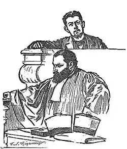 In any case, this innovative aspect of terrorism continued during his trial, which began on 27 April 1894.[12][18][19] Unlike Vaillant or Ravachol, who both presented themselves as avengers during their respective trials, Henry portrayed himself as a fighter in a war to the death.[12][19] To him, society was engaged in a total war between the bourgeoisie and the rest of the population, with only two kinds of people: those who resist, those who oppress, and those who fail to realize they are complicit.[12][19] Thus, he saw the majority of French society as a legitimate target. He made no attempt to downplay his actions—on the contrary, he fully assumed them and even lamented that he had not killed more people.[12][19] According to Bouhey and Badier, this stance may have been an attempt to obscure the possible involvement of his brother and Chailliey in the Carmaux-Bons-Enfants bombing.[5][12]
