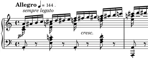The melody consists of rapid chromatic scale figures played by the outer right-hand fingers, accompanied by chord attacks. Like most of Chopin's other études, this work is in ternary form A–B–A. The harmonic scheme of the A section is relatively simple, with A minor, E major, A minor, but the chromatic scale and the exotic clash of its C♯s with the A minor chords tend to veil the clarity of A minor and create a mysterious sound effect further increased by the Neapolitan chord, bar 15. The middle section brings a dramatic increase with the dynamic climax exactly in the center of the piece, bar 25. This climax is approached by stepwise rising two-bar sequences from F major to A minor via G minor. The final dominant seventh chord of each sequence leads to the next one by means of a deceptive cadence.[6] The longer and asymmetric second part of the B section, leading back to the restatement of the A section, uses a similar harmonic progression but shorter sequences. The final A section is a quite literal though shortened restatement of the first one ending with a coda of a rising and falling scale into a Picardy ending.