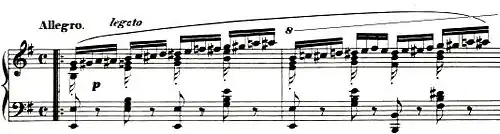 Musicologist Hugo Leichtentritt (1874–1951) calls the étude a "moto perpetuo".[10] The transparent texture of nonstop semiquavers accompanied by a light "dancing" bass has its forerunners in Bach's Prelude No. 5 in D major (BWV 850) from the first book of The Well-Tempered Clavier and resembles other virtuoso pieces from around 1830 such as Paganini's Moto Perpetuo for violin and piano. In Robert Schumann's substantial 1836 Neue Zeitschrift für Musik article on piano études,[11] all Chopin Études Op. 10 are awarded an asterisk (*) for "poetic character" except No. 2. But Leichtentritt describes its sound effect as the "murmuring and blowing of a gentle wind",[10] French pianist Alfred Cortot (1877–1962) mentions its "gliding and vaporous character"[12] and Alfredo Casella talks about a "character of swift, aerial and unsubstantial mysteriousness".[13] The American music critic James Huneker (1857–1921) writes that "the entire composition, with its murmuring, meandering, chromatic character, is a forerunner to the whispering, weaving, moonlit effects in some of [Chopin's] later studies".[9]