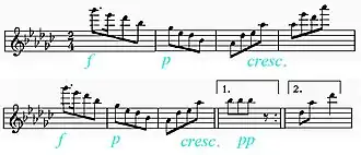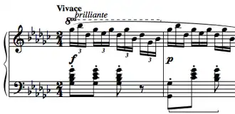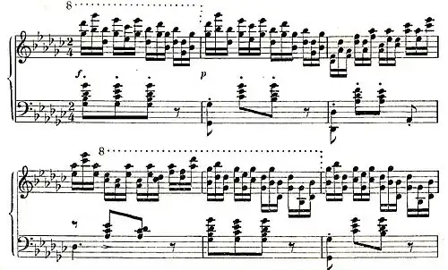 D♭ major is also the key of the middle section which is exactly twice as long as the A section. Its 32 bars though do not subdivide into four eight-bar periods but into sections of (4 + 2) + 4 + 2 + 4 + 8 + 8 bars with six motivically distinct modifications of the original semiquaver triplet figure, thus offering an attractive break from the symmetry.[7]: 106 An effective dynamic increase begins in bar 23 but does not end in a climax as the crescendo does not lead to fortissimo but eases off in diminuendos (bars 36 and 40).[7]: 107 Harmonically the section (bars 23–41) may be interpreted as an extended and ornamented D-flat major cadence.[7]: 107 Musicologist Hugo Leichtentritt (1874–1951) compares the left hand of bars 33–48 to horn signals.[7]: 108 These "announce" the recapitulation of the A part which begins as a literal restatement in bar 49, seems to approach a climax and eases off with a sudden delicatissimo pianissimo smorzando passage, leading via a cadence to the coda. The coda consists of two periods, the last one stretched by three bars.[7]: 109 Only the last nine bars (from bars 77 to 85) uses the black keys on both hands. The first one is a restatement of the middle section's opening transposed to the tonic G♭ major. The consequent of the second period contains a brilliantly swooshing, widely positioned arpeggio for both hands (bars 79(83) and is pianistically attractive. Its effect is based on the accent enforced by a third at the beginning of each triplet, as well as on the tenth and eleventh stretches of the left hand and the ascending bass line covering the entire range of the keyboard.[7]: 109 The piece ends with a rapid octave passage, ff and staccato, played by both hands on black keys, in a G♭ major pentatonic scale. Some prominent performers, including Horowitz and Rosenthal, choose to perform the final octave passage glissando.[8]
