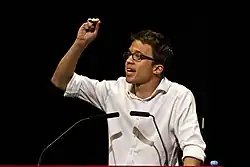 According to Chazel and Fernández, Errejón transitioned from the anarchist and libertarian sensibilities of his youth to an interest in Latin American populism, displaying a convergence toward the Essex School of discourse analysis in his PhD dissertation, underpinning the intellectual goal of the creation of hegemony through discourse.[63] A follower of Ernesto Laclau (whom he has explicitly cited several times as leading intellectual reference)[64] and Chantal Mouffe, Errejón has been considered as the "most forthcoming" figure in Podemos when it came to embrace the party as populist.[65] According to Franzé, rather than as antagonism between already existing actors, Errejón would understand populism as a reconfiguration of the legitimate demos.[66]