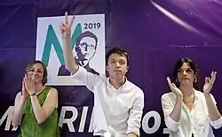 In January 2019, Errejón announced he would run in the regional election under the Más Madrid list,[49] the platform previously presented by Manuela Carmena (the Mayor of Madrid) in order to run in the municipal election (both the regional and municipal elections were to be celebrated on 26 May). While the initiative of Más Madrid was purposely open to further negotiation to include Podemos in some form (it was framed by Errejón as an "invitation" rather than as a "split"),[50] this formal unlinking from the party unleashed an internal crisis in Podemos. The crisis' toll took Ramón Espinar (the regional leader of Podemos in Madrid), who quit frontline politics in disagreement with the decision taken by Iglesias of actually presenting an alternative list to Errejón's in the regional election[51] (Podemos had convened not to present an alternative list to Carmena's vis-à-vis the municipal election). Errejón was then asked to leave his seat of deputy, and he (still leaving a door open to reach a unitary list of Más Madrid with Podemos, IU and Equo) quit the Congress of Deputies on 21 January.[52]