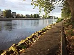 The Île de la Jatte (French pronunciation: [il də la ʒat]) or Île de la Grande Jatte ([- ɡʁɑ̃d ʒat]) is an island in the river Seine, located in the department of Hauts-de-Seine, and shared between the two communes of Neuilly-sur-Seine and Levallois. It is situated at the very gates of Paris, being 7 km distant (in a straight line) from the towers of Notre Dame and 3 km from the Place de l'Étoile. The island, which has about 4,000 inhabitants, is nearly 2 km long and almost 200 m wide at its widest point. Its name translates as "Island of the Bowl" or "Island of the Big Bowl".