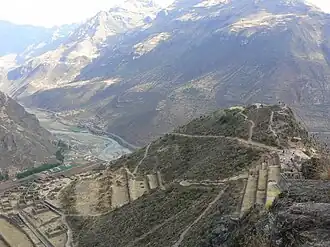 View of the Sacred Valley and the Willkanuta River in Písac. Ñustapata is in the background on the right. | |
