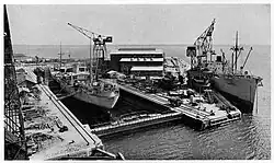 The shipyard was opened on 21 September 1918 with the launch of the first ship, the steamer Torild, built by Rederi AB Percivald in Landskrona. The company expanded quickly and by Autumn 1920 the yard had grown to 15 hectares (37 acres) with a 150-metre (490 ft) long fit-out in 7 metres (23 ft) of water. In 1922, the shipyard could build eleven new vessels of 50,000 tonnes (49,000 long tons; 55,000 short tons), but it was declared bankrupt due to poor economic conditions. New Oresund Shipbuilding Company (Swedish: Nya Varvsaktiebolaget Öresund) was formed in April 1923 which could build seven vessels of 26,000 tonnes (26,000 long tons; 29,000 short tons) deadweight. In 1935, the company name was changed to Öresundsvarvet AB.[2] A floating dock for vessels up to 5,000 tonnes (4,900 long tons; 5,500 short tons) was purchased from Copenhagen in 1936. The shipyard was taken over in 1940 by Götaverken, who then supplied the shipyard's newbuildings with new machinery. During World War II, the yard built a coastal destroyer and two minesweepers. In all, during the period from 1931 to 1944 the shipyard built fifty ships totalling 220,000 tonnes (220,000 long tons; 240,000 short tons).[3]