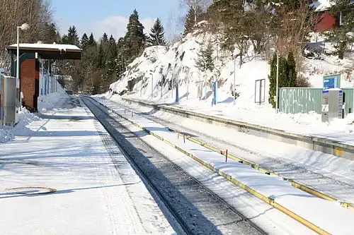 Østhorn has two platforms, with a wooden shed on the southbound platform.[13] The sheds are designed by Arne Henriksen in a minimalist and standardised style with constructions of wood and steel.[14][15] Østhorn serves the residential areas Korsvoll and Nordberg.[16][17] The station is located at the bottom of a small hill named Havnabakken, where local residents toboggan at winter's time.[18][19]