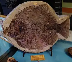 An Osteichthyes, member of the family Pycnodontiformes inside Neopterygii. It is located on the dorsal side, with the skull bones frontal and parietal are strongly intertwined it extends strongly towards the anterior end of the skull. It has an interoperculum larger than any other fish taxon. The posterior scales on the fossil is characterized by the appearance of a 2–3-pronged spike.[6] |