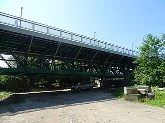 46°6′2.21″N 14°31′8.67″E / 46.1006139°N 14.5190750°E The Črnuče Road Bridge (Slovene: Črnuški cestni most) is a road bridge crossing the Sava River in Črnuče, a district of Ljubljana, the capital of Slovenia. The bridge, which dates to 1906, is 143 metres (469 ft) long. It forms part of the Vienna Road (Dunajska cesta), a main road artery of Ljubljana, and is used by local bus lines Nos. 6, 8, and 21.[2] The bridge was for the last time renovated in 2014.[3] Downstream of the road bridge runs the Črnuče Railway Bridge (Slovene: Črnuški železniški most) with a metal framed structure. Its construction took place as part of the project to connect by railway the towns of Ljubljana and Kamnik, and it was completed in 1891. This bridge was demolished in 1945, during World War II, but was then rebuilt.[4]